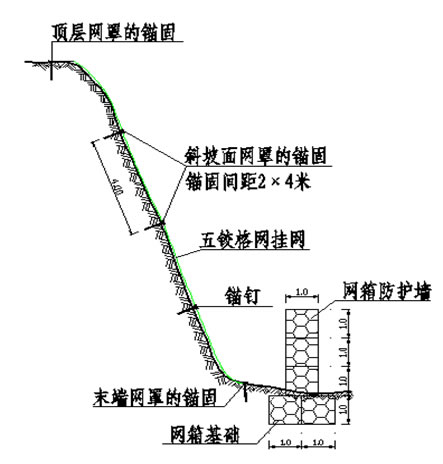 在有些不穩(wěn)定的巖質(zhì)山坡下的建筑物存在地質(zhì)威脅,為了減小原來巖質(zhì)山坡對(duì)建筑和一些設(shè)施的潛在威脅,需要對(duì)巖質(zhì)山坡進(jìn)行防護(hù)。在滿足工程需要的情況下考慮到與環(huán)境生態(tài)的效果。在有巖石突出的山坡下面采用擋墻形式。石頭可以就近取材,生態(tài)石籠網(wǎng)采用高鍍鋅鋼絲外包PVC材料,PVC覆層采用灰色以便與環(huán)境相和諧。山坡下的網(wǎng)箱結(jié)構(gòu)可以有效阻擋突出巖石山坡落下的碎石和滑土,同時(shí)格網(wǎng)結(jié)構(gòu)就近取石材,結(jié)構(gòu)與環(huán)境融為一體。生態(tài)格賓網(wǎng)結(jié)構(gòu)對(duì)基礎(chǔ)要求不高,而且便于施工,施工速度快,造價(jià)低。安裝過程中將多個(gè)網(wǎng)箱或網(wǎng)墊綁扎在一起,形成一個(gè)均勻的結(jié)構(gòu),整體性好,能抵擋落石對(duì)擋墻結(jié)構(gòu)的沖擊。